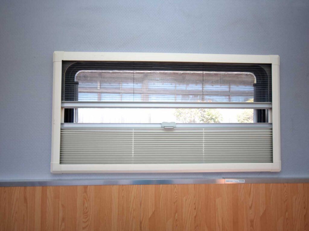 窓は、キャンピングカー用のアクリル2重窓、断熱性にも優れ、網戸とシェードも内蔵しています。